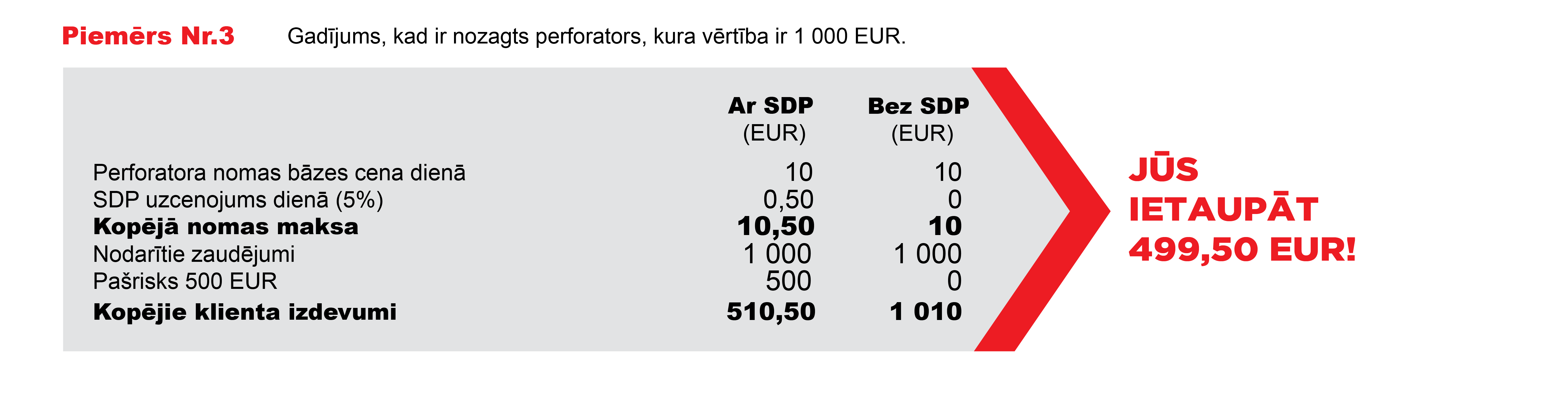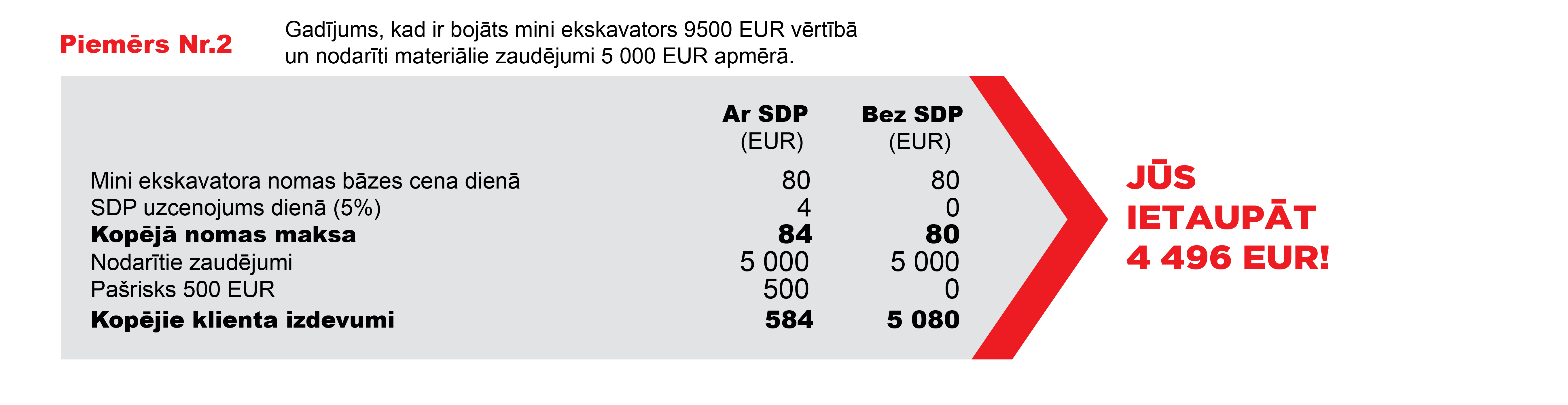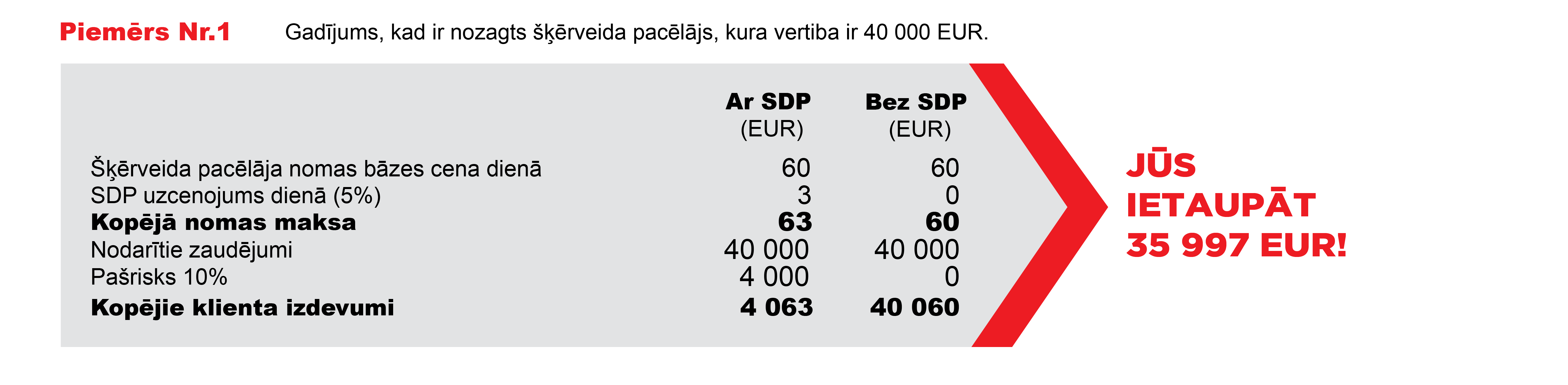 Notiekot negadījumam, ja izmantojat SDP, jums būs jāsedz tikai pašrisks, kas sastāda 10% no zaudējumu apjoma, bet ne mazāk kā 500 EUR tehnikai ar vērtību līdz 10 000 EUR, un ne mazāk kā 1500 EUR tehnikai ar vērtību virs 10 000 EUR.